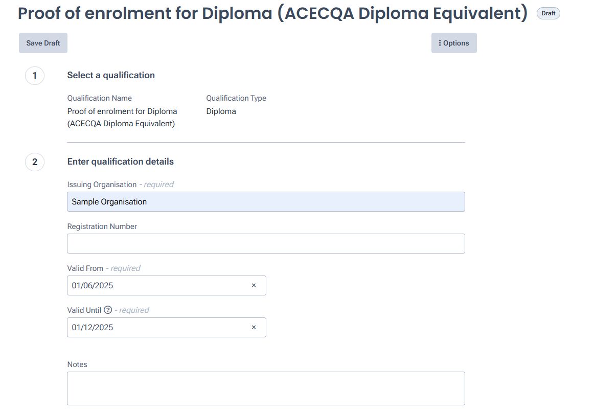 These instructions have sections for those who have completed a qualification (uploading proof you have finished an approved course) or are actively working towards an approved course (uploading a transcript/enrollment qualification.