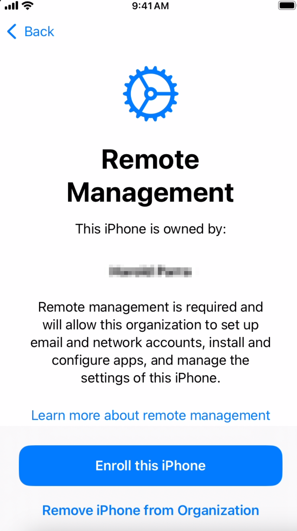 When this screen appears you must select the blue "Enroll this iPhone" button. This will download our company profile and default applications to your phone. If you do not click this button you will not have access to any applications.