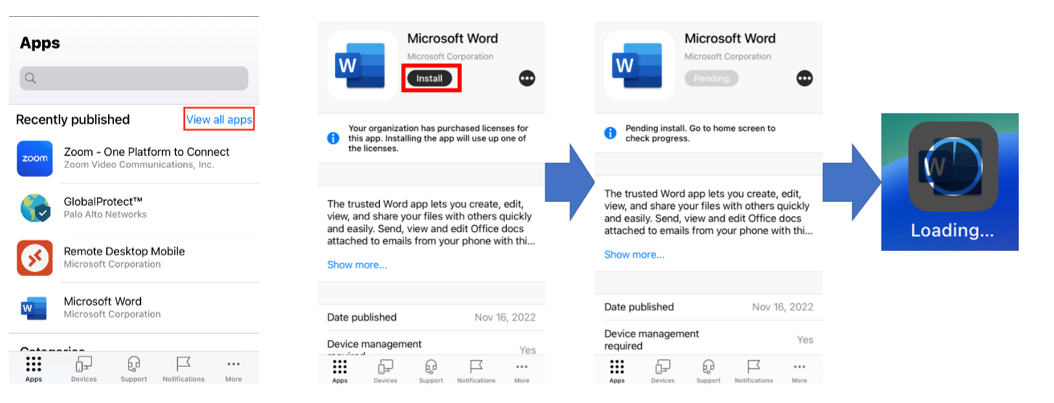 When setting up your phone, the system will automatically install the Office suite (Outlook, Teams, Word, OneDrive etc. ) on the device. Additional applications can only be installed through the Company Portal. This includes a selection of pre-approved application including state based emergency services and tools for Area Managers.
