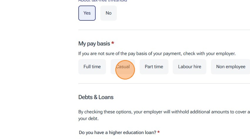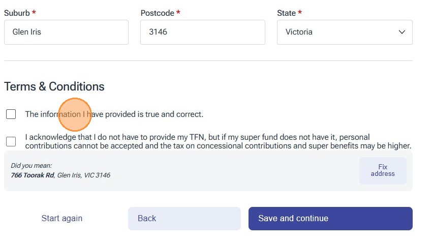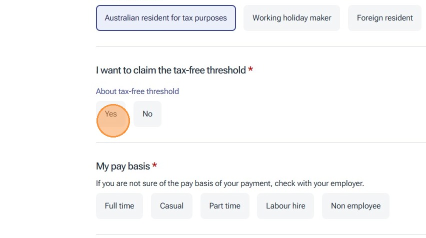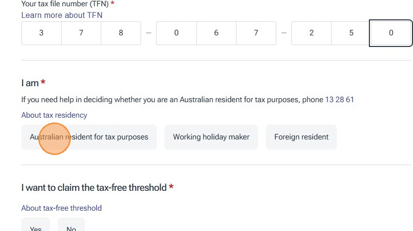 For the purposes of this instruction guide we have used the Australian Resident option who has a Tax File Number and selected that we already have a super fund, however please ensure that you select the applicable options for your situation and follow the prompts on screen.