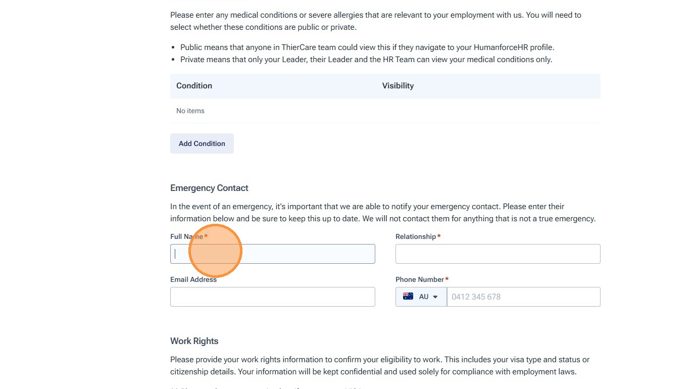 9. Enter your emergency contact persons name, relationship to you, email and contact number.