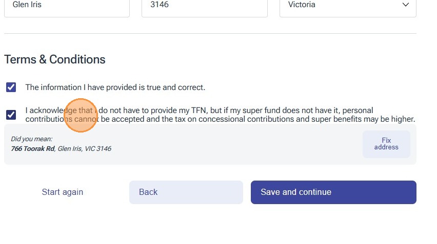 33. Click "I acknowledge that I do not have to provide my TFN, but if my super fund does not have it, personal contributions cannot be accepted and the tax..."